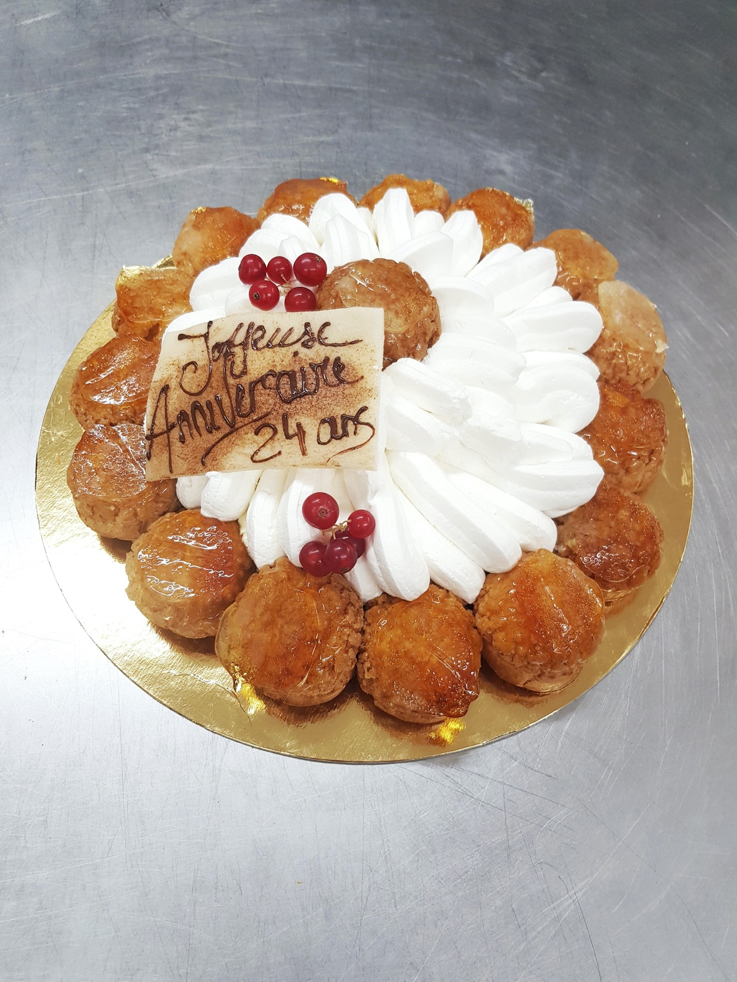 Pâte feuilletée, choux caramélisés, chantilly, crème (parfums au choix: vanille, chocolat)