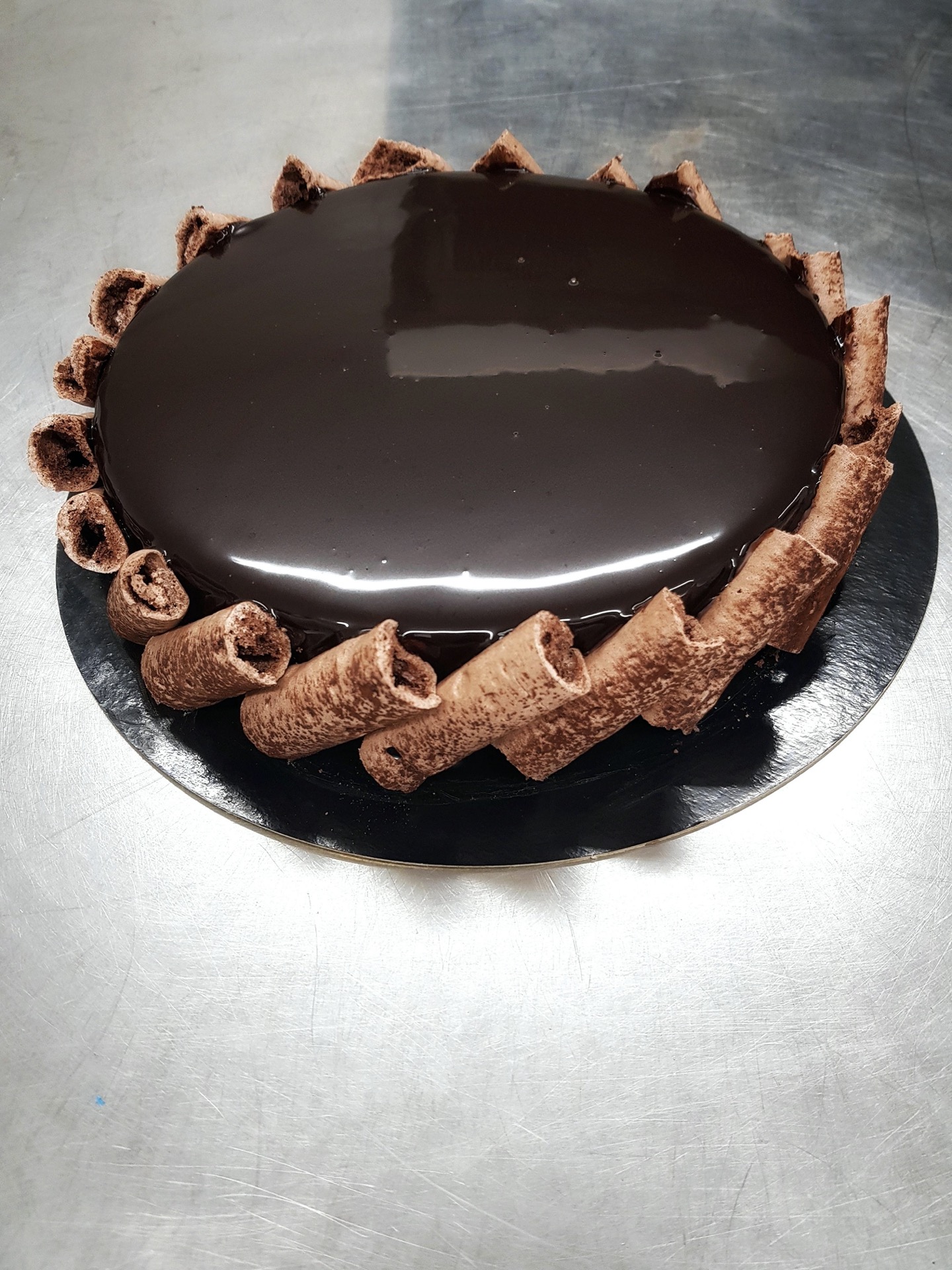 Biscuit chocolat, croustillant praliné, mousse chocolat noir, glaçage noir.