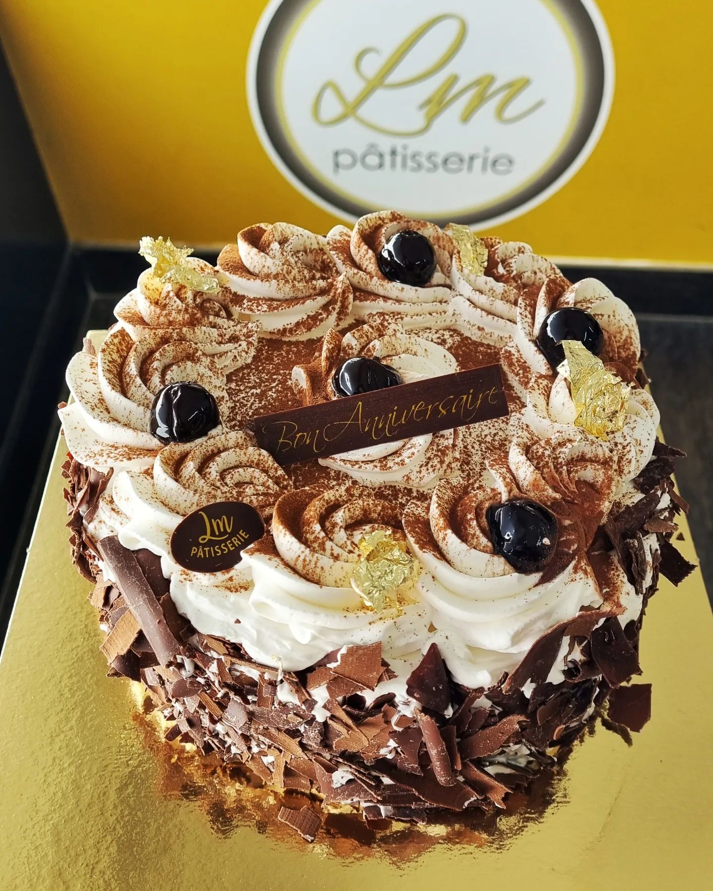 Génoise chocolat, mousse stracciatella, gelée kirsh, amarena.