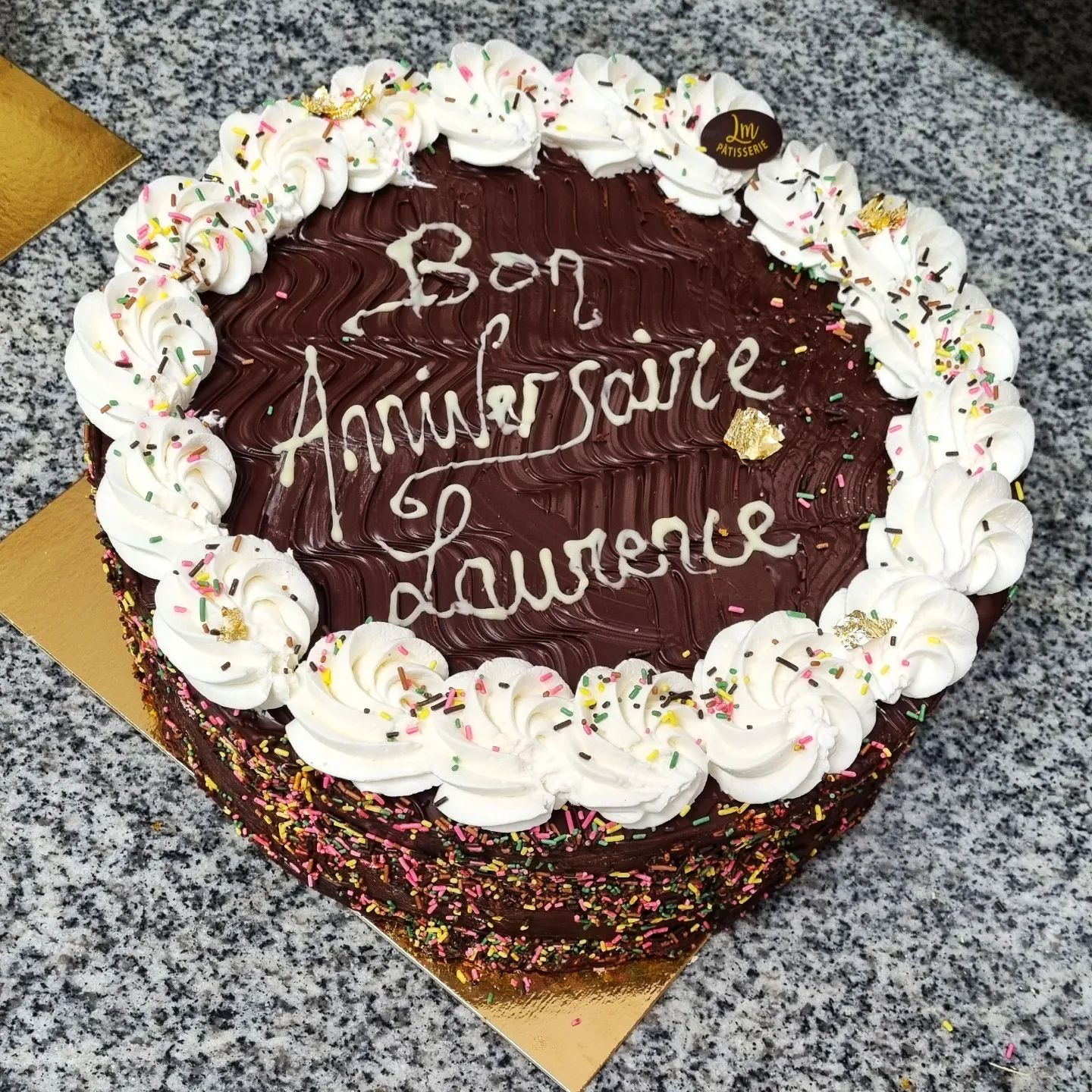 Génoise, crème patissière, chocolat noir, vermicelles chocolat.